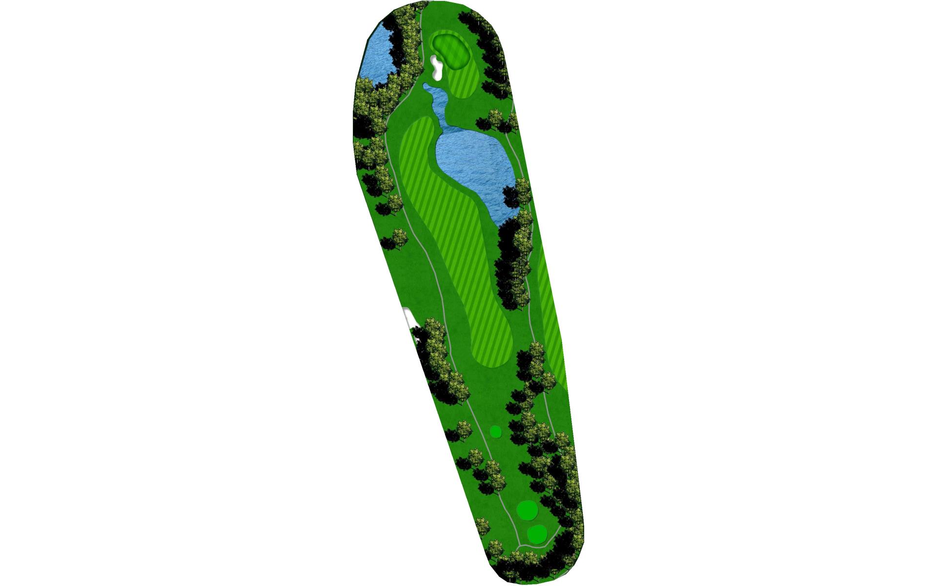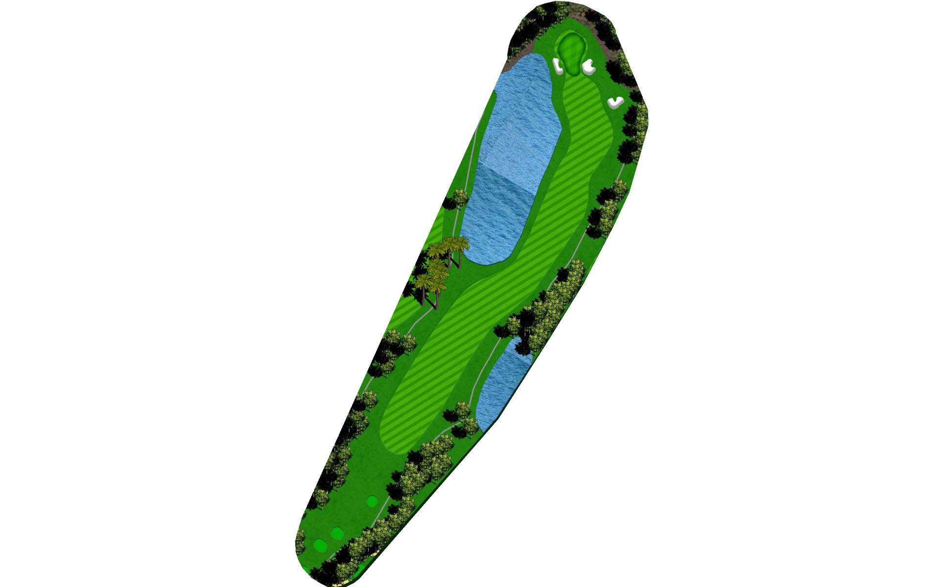 The closing hole is a par 5 that requires a tee shot in play for a chance at par or better. Avoid the water on the right and the pond that protects the second half of the hole on the left. The green is guarded by both water and sand, so players must be careful to avoid those.
