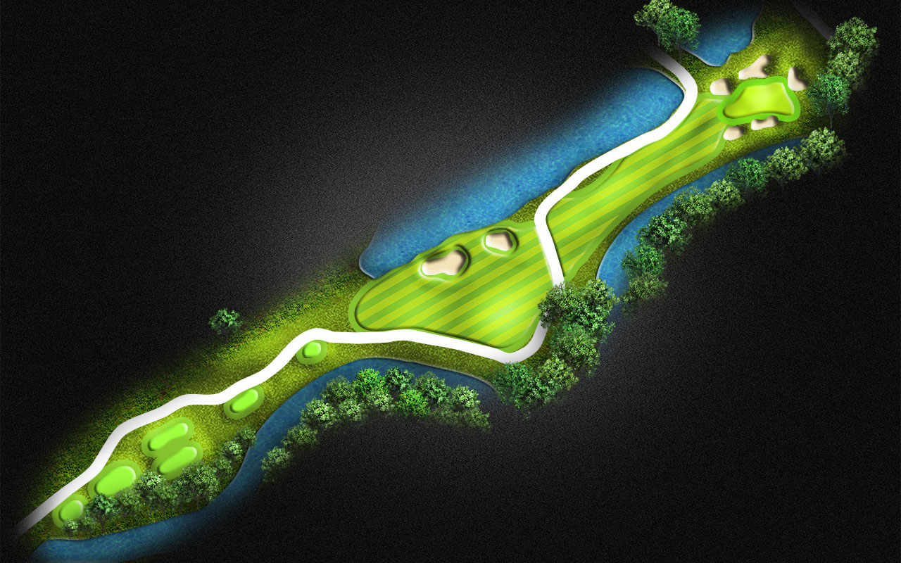 A demanding tee shot on the Par 5 is crucial. You must lay up between the water on the right and left. Long hitters will have a chance to get to the green in 2.