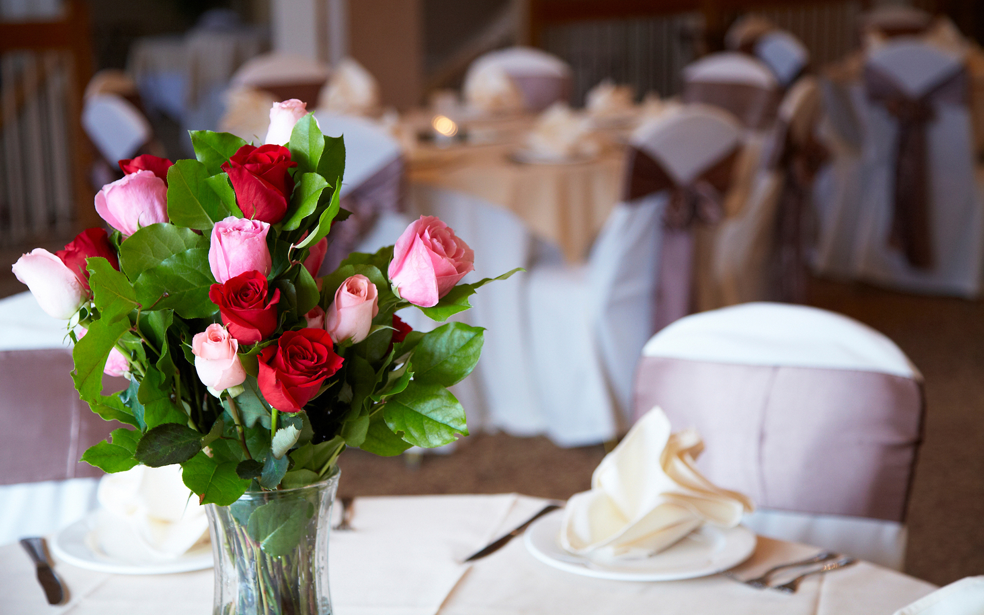 The Ballroom is comprised of three rooms, the Greenbrier, Chesapeake and Virginia Rooms which may be partitioned off for smaller private dining/meeting rooms. The sliding glass doors leading to the balcony are a welcome invitation for your guests to enjoy the fresh air and the beautiful view. The ballroom can seat up to 150 guests and host a standing reception for up to 200 guests. Opening the French Doors to the Fairway Room creates an elegant picture for your larger parties, seating up to 275 guests.