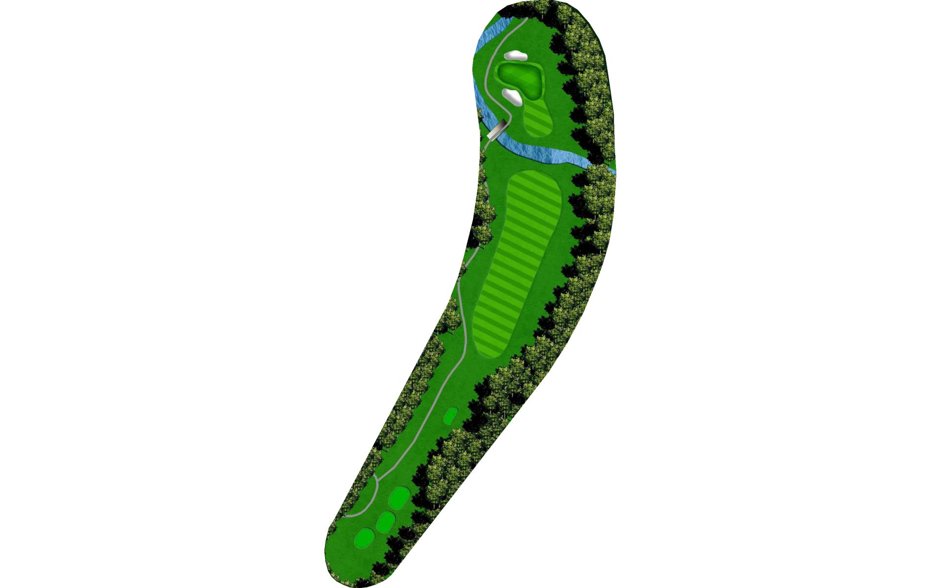 | Your tee shot is your most important here. A long drive over Swift Creek sets up a short iron approach and chance for birdie. A laid-up drive creates a more difficult approach. |