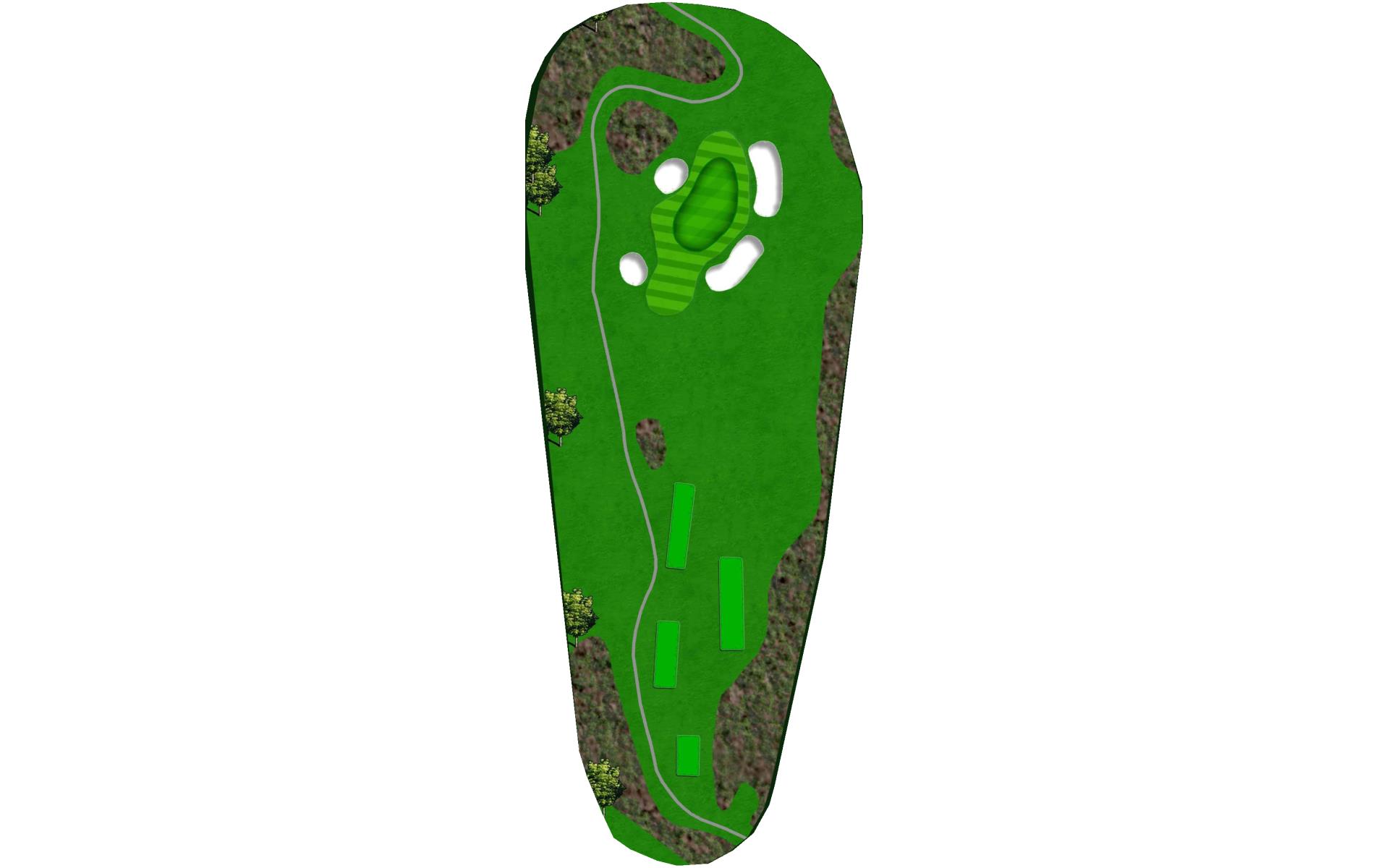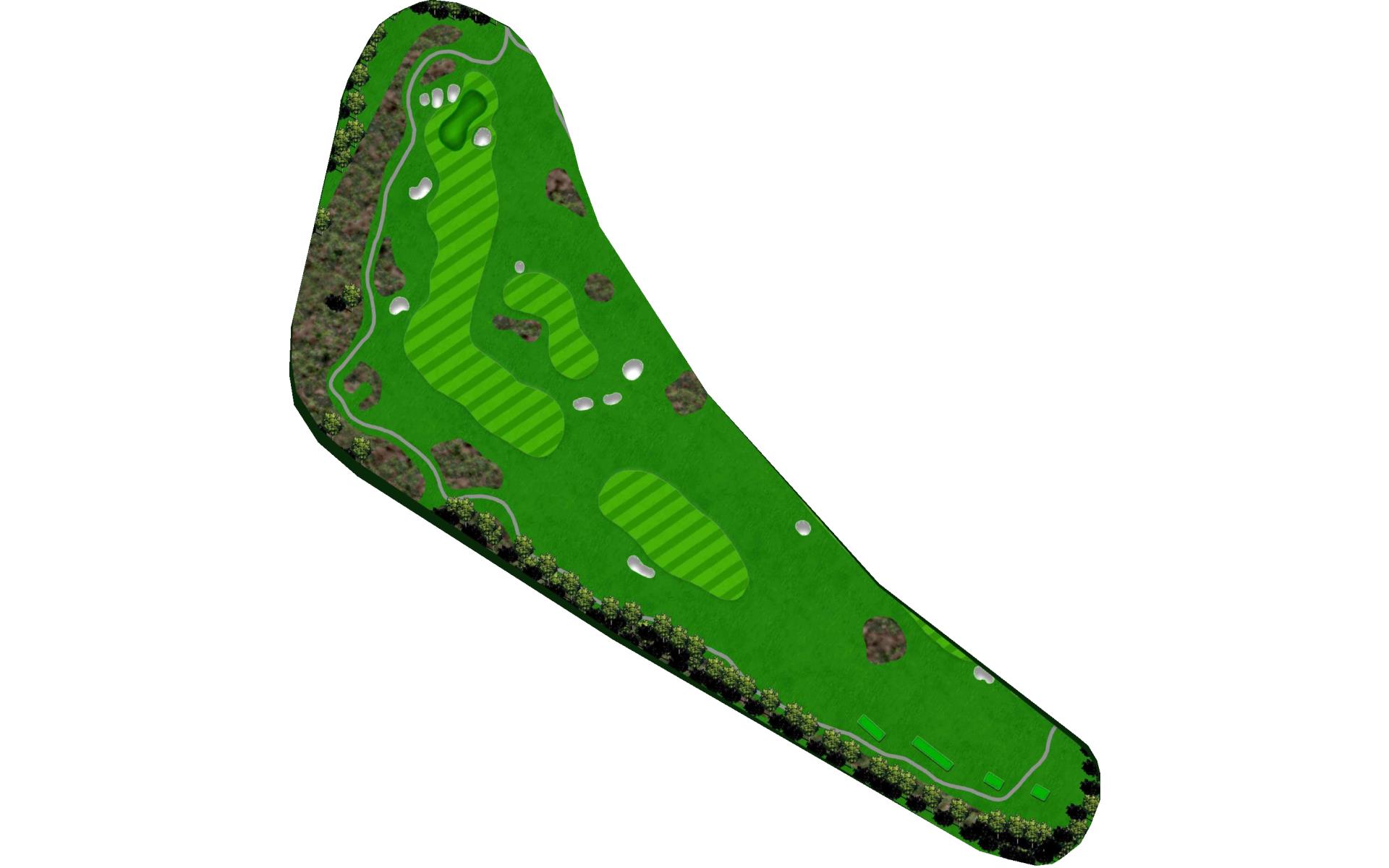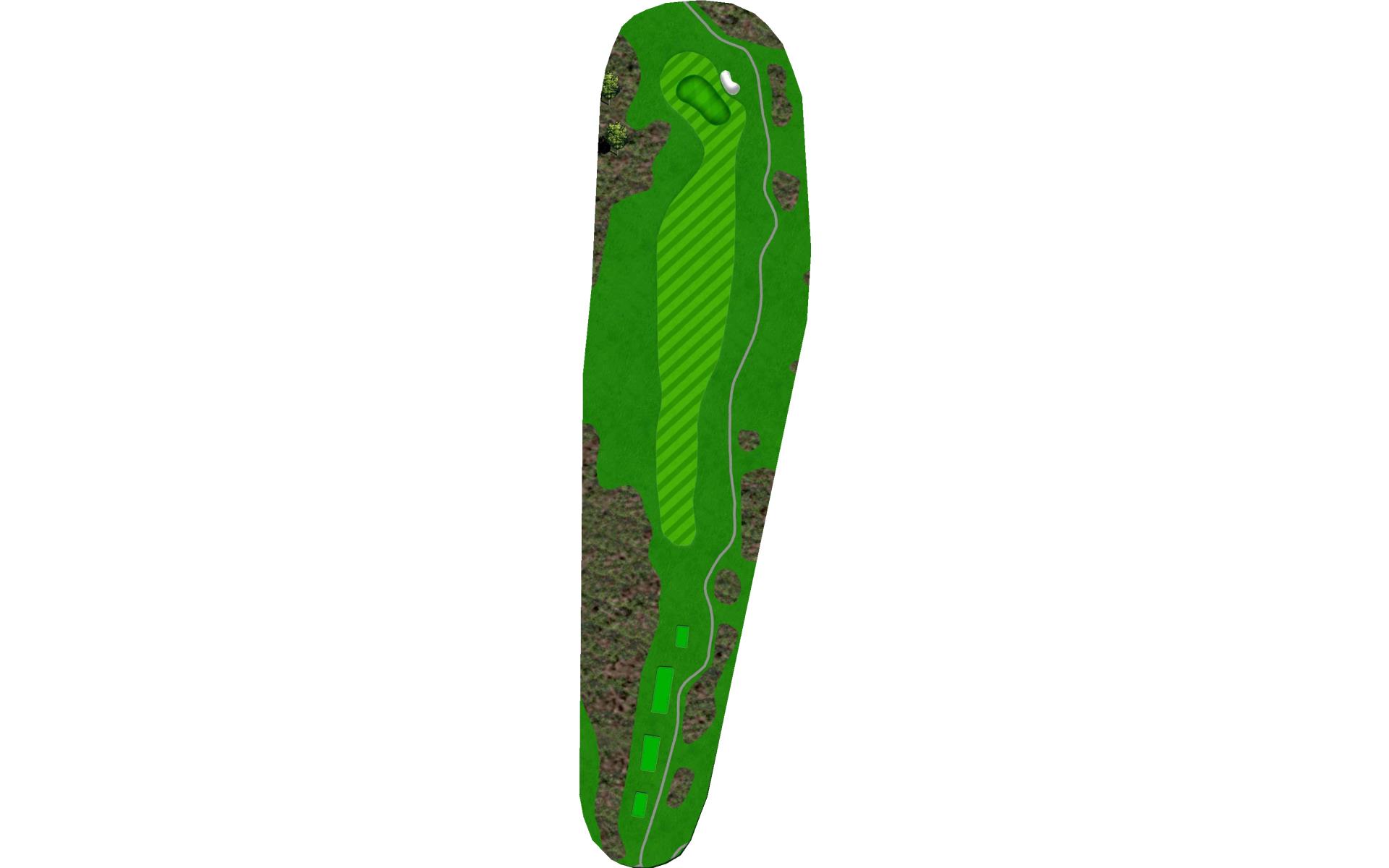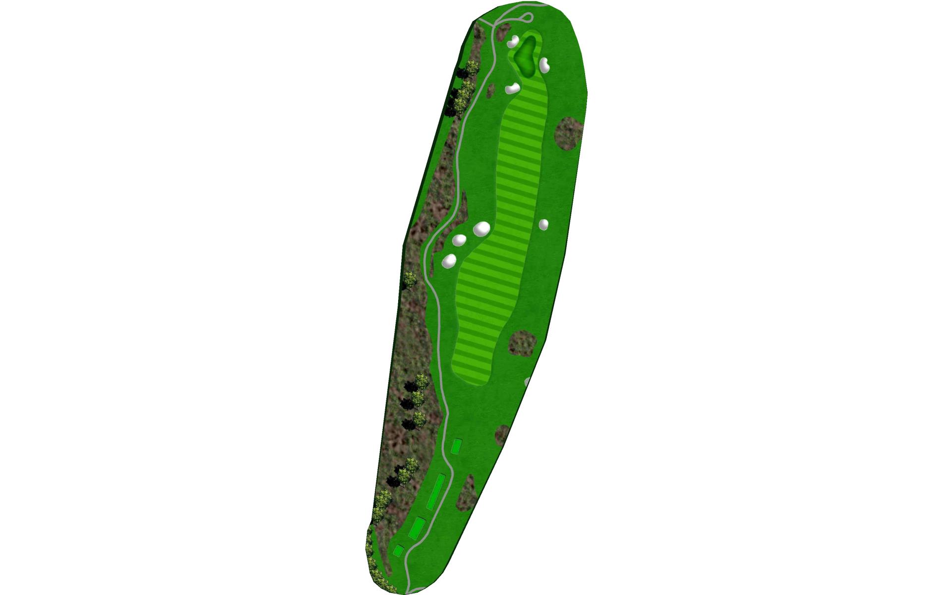 A long drive down the right side allows for a chance at the green in two. The three bunkers are just for appearance, the real trouble is the deep corner bunker in route to the green. Your smart play is to hit to the left of the trouble on your second shot. You may have a longer shot but you will have an open approach to the fat part of the green.