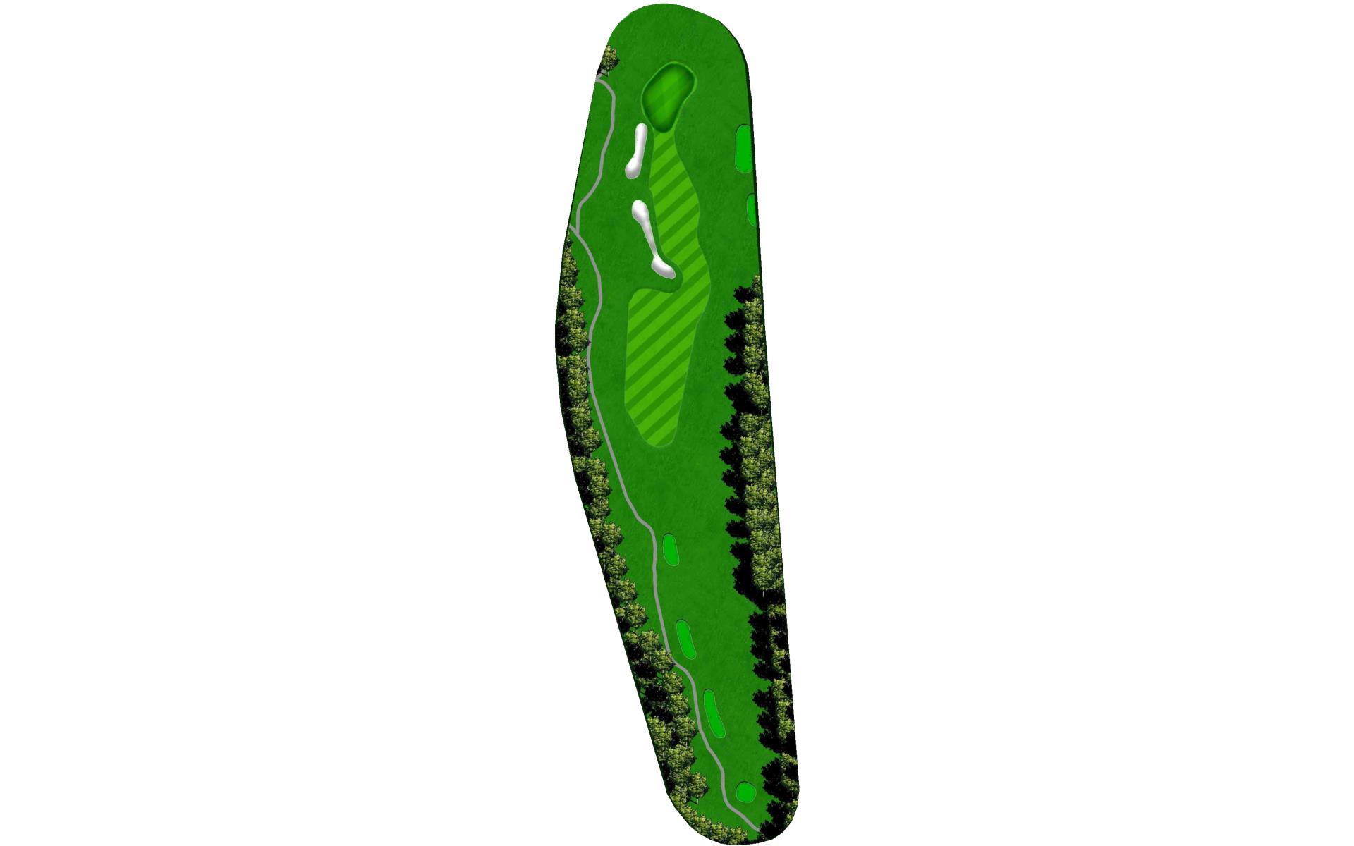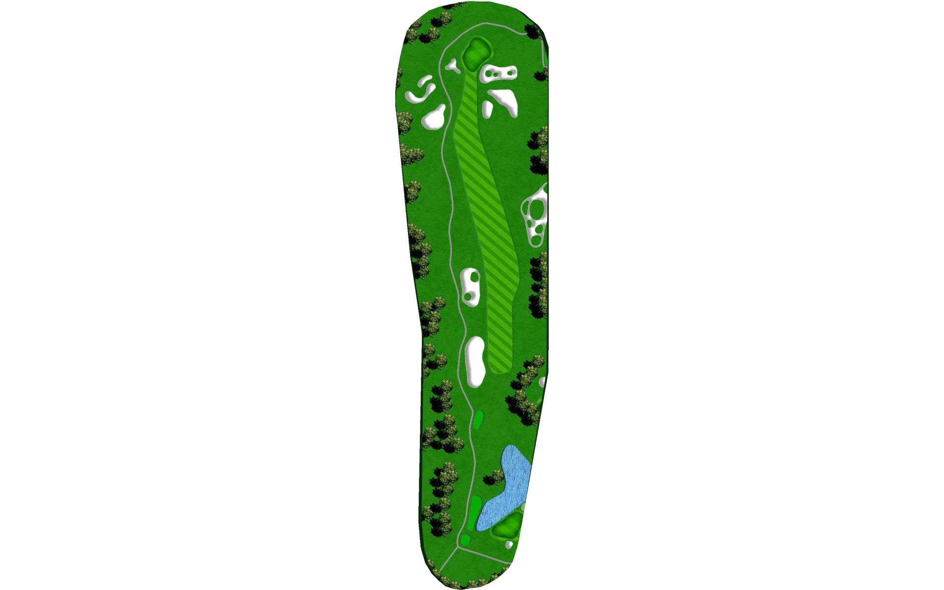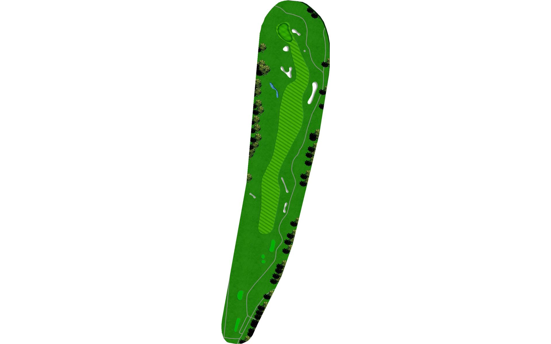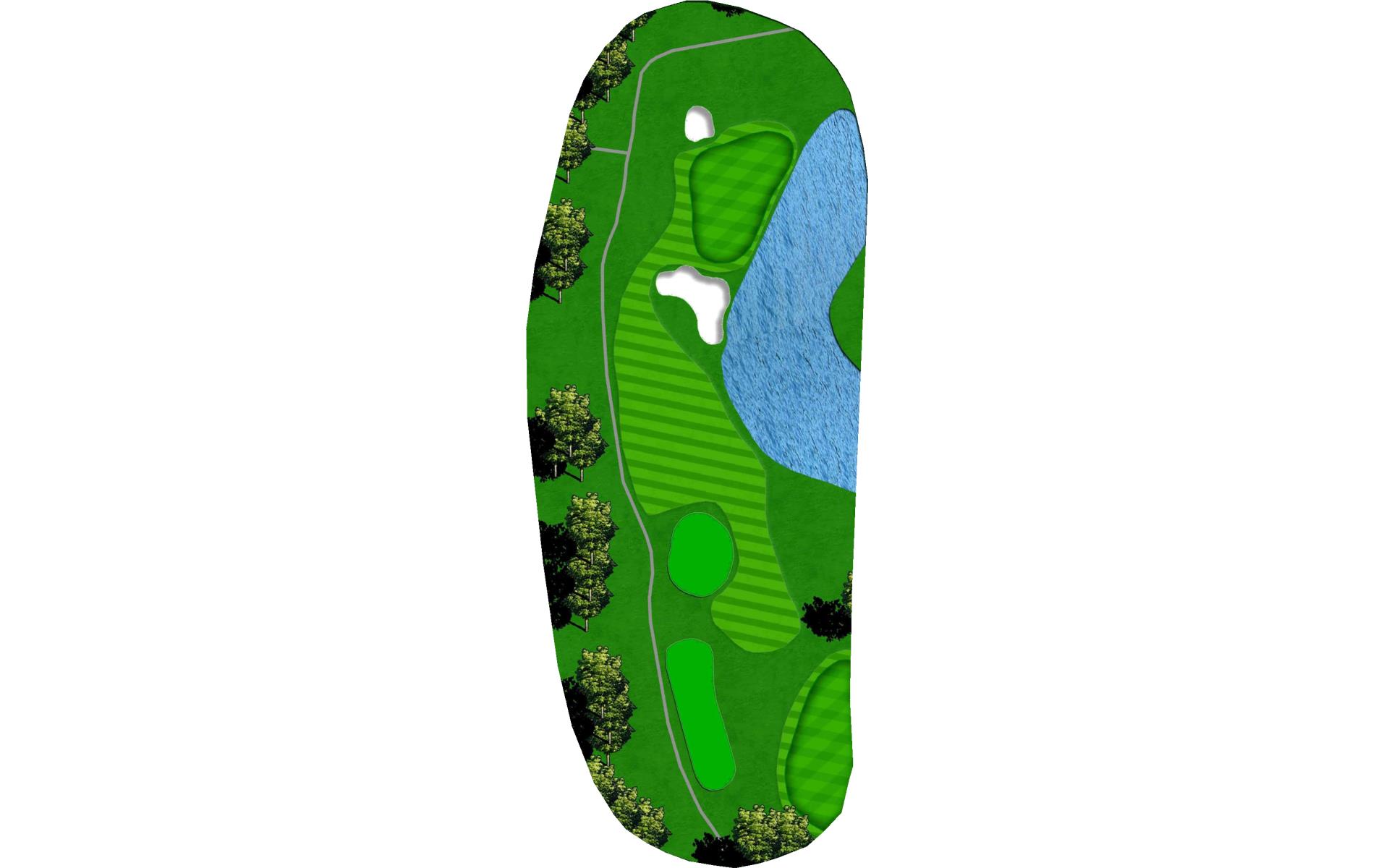 Downwind par 4 with pond at the end of fairway which lines the left side of green as well. Solid tee ball will leave short iron to relatively flat green. Avoid bunkers short right and long.