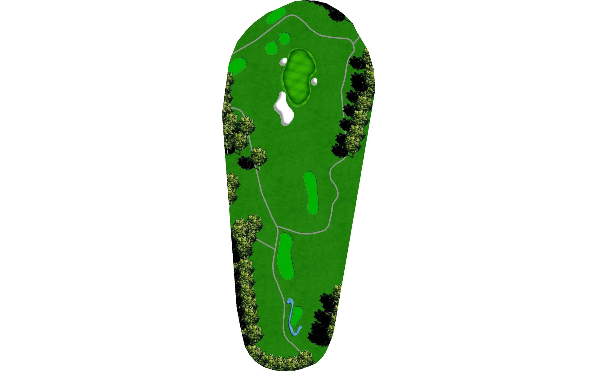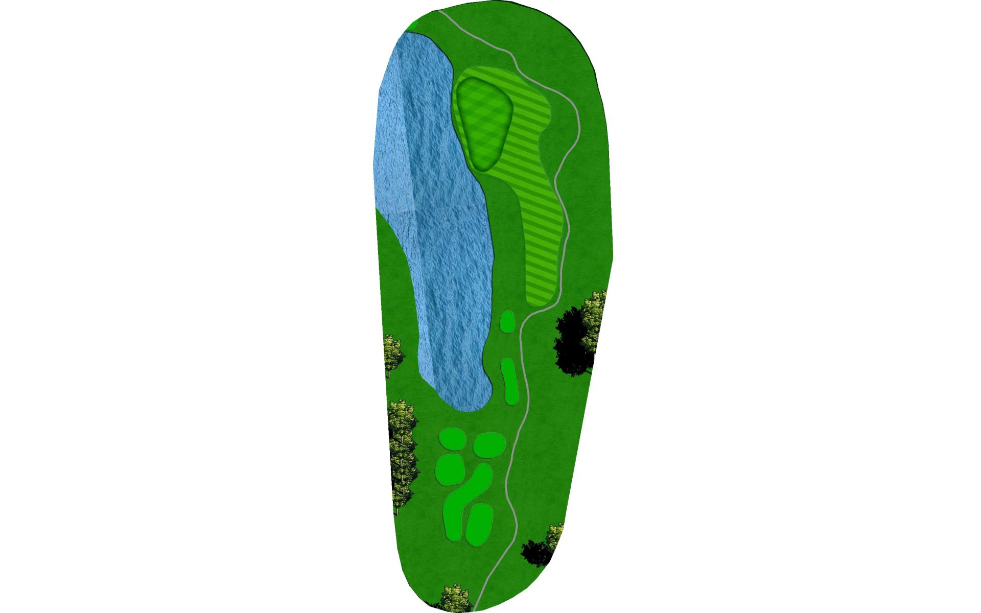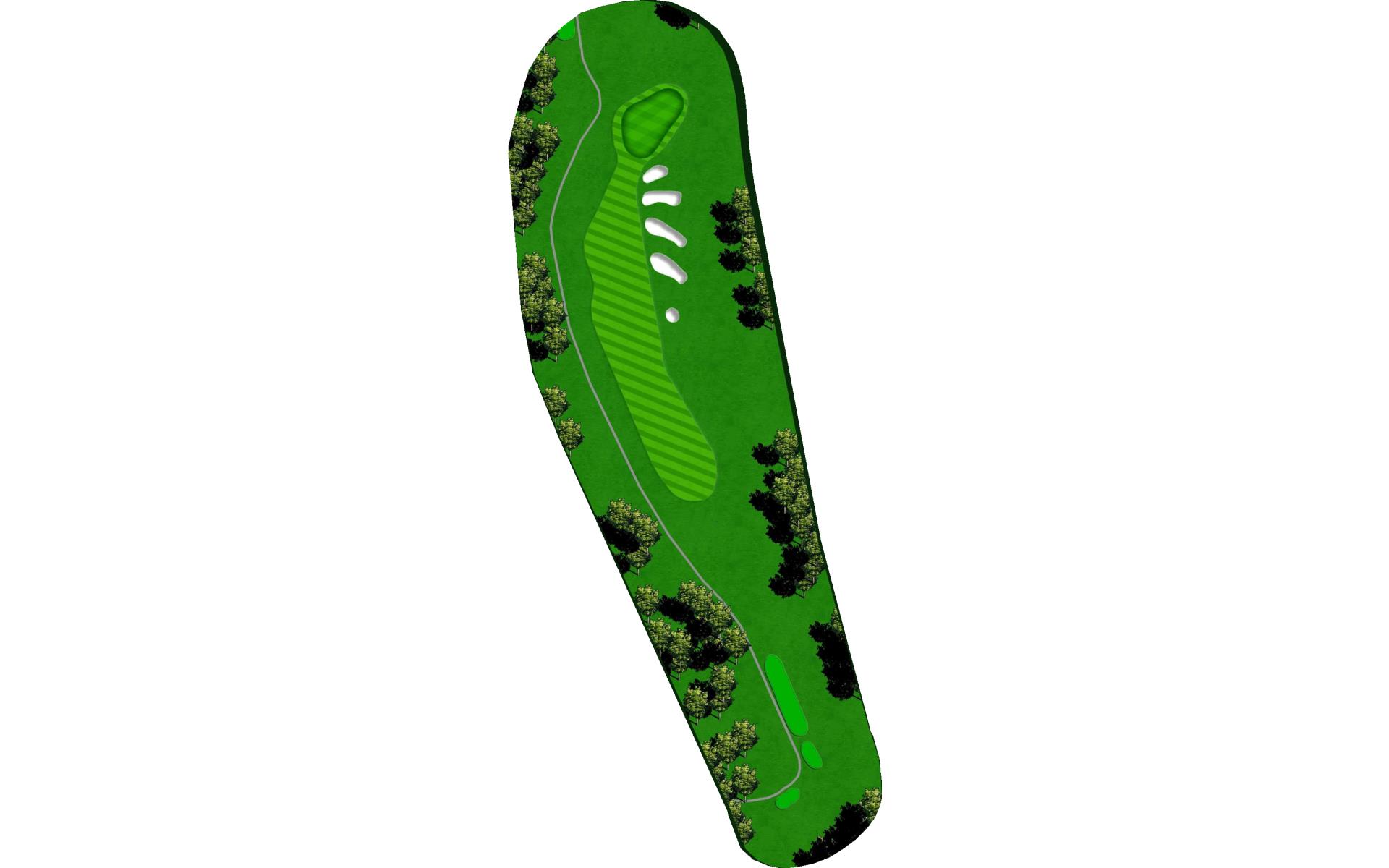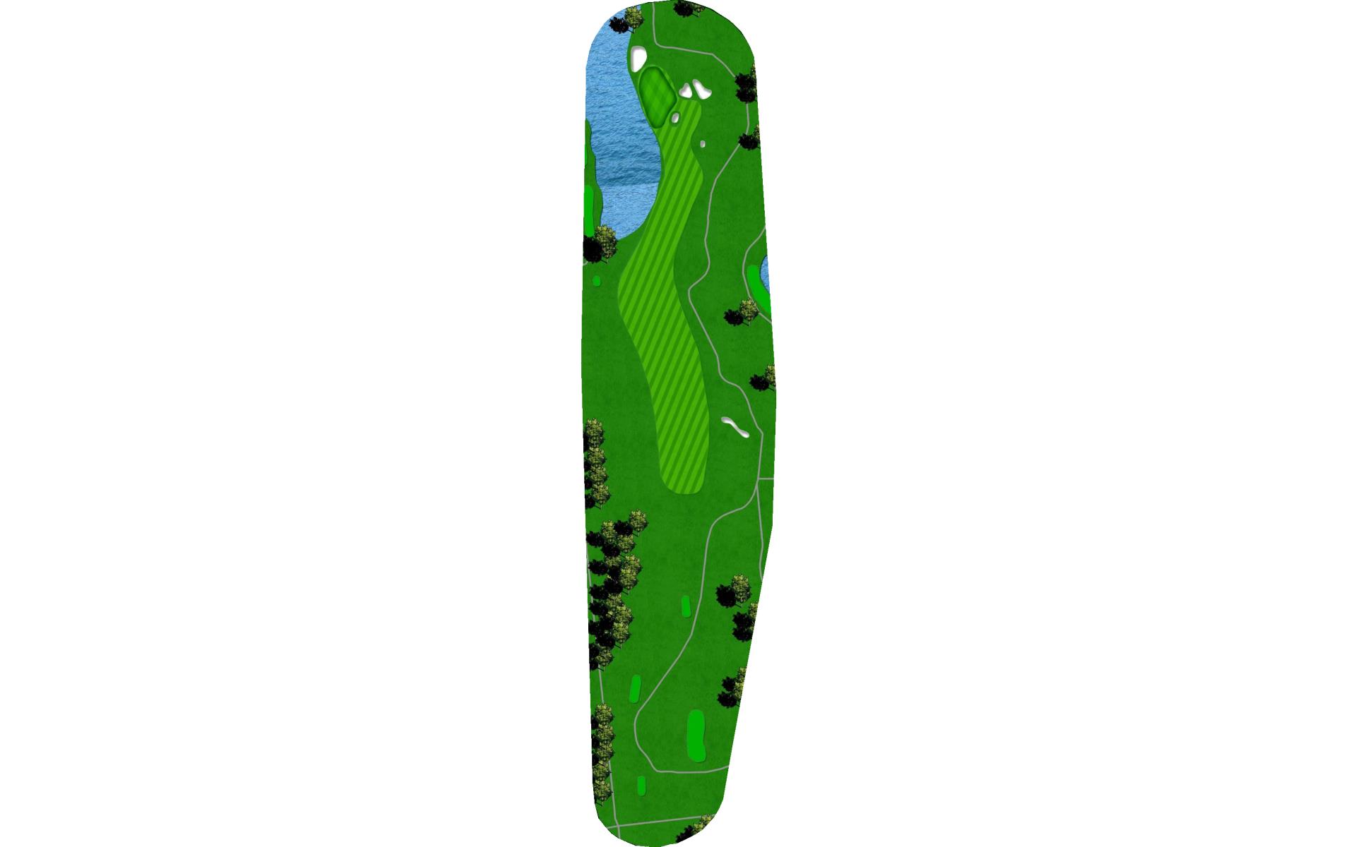 Downwind par 4 with pond at the end of fairway which lines the left side of green as well. Solid tee ball will leave short iron to relatively flat green. Avoid bunkers short right and long.
