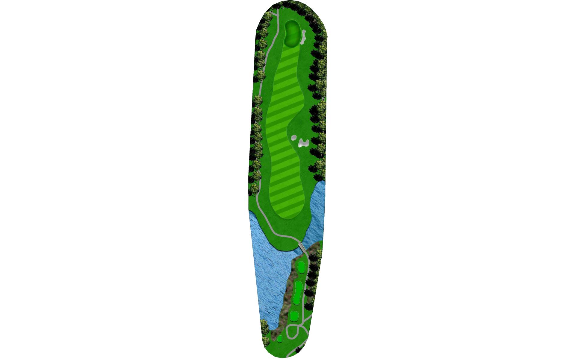 Favor right side fairway off the tee. Long hitters can reach water that cuts in at the end of the fairway. This hole is very exposed to wind, don’t let it blow you left.