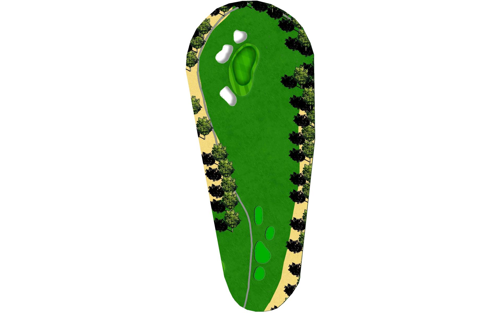 A dogleg left with a fairway bunker guarding the left corner. An accurate second shot will give an easier approach to the elevated two-level green. Aim left of the fairway to avoid the mounds on the right.