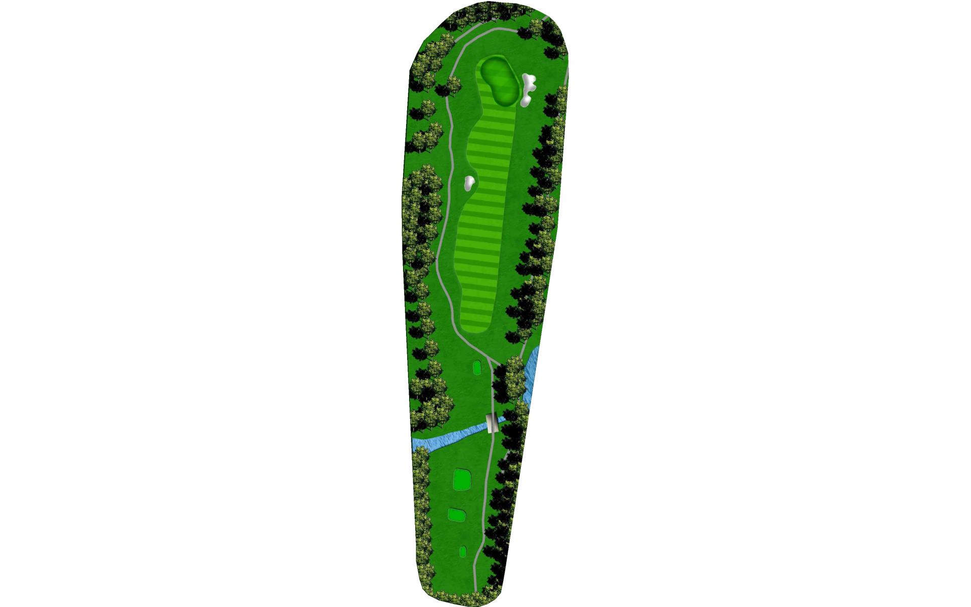 A scenic downhill dog leg right par 4 with a forced carry on your tee shot over a large creek. A very difficult second shot up hill to another well bunkered, spacious green.