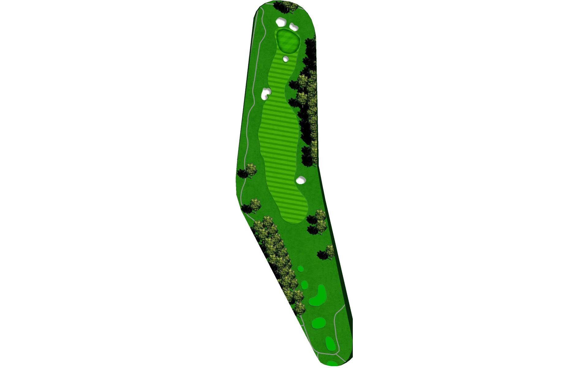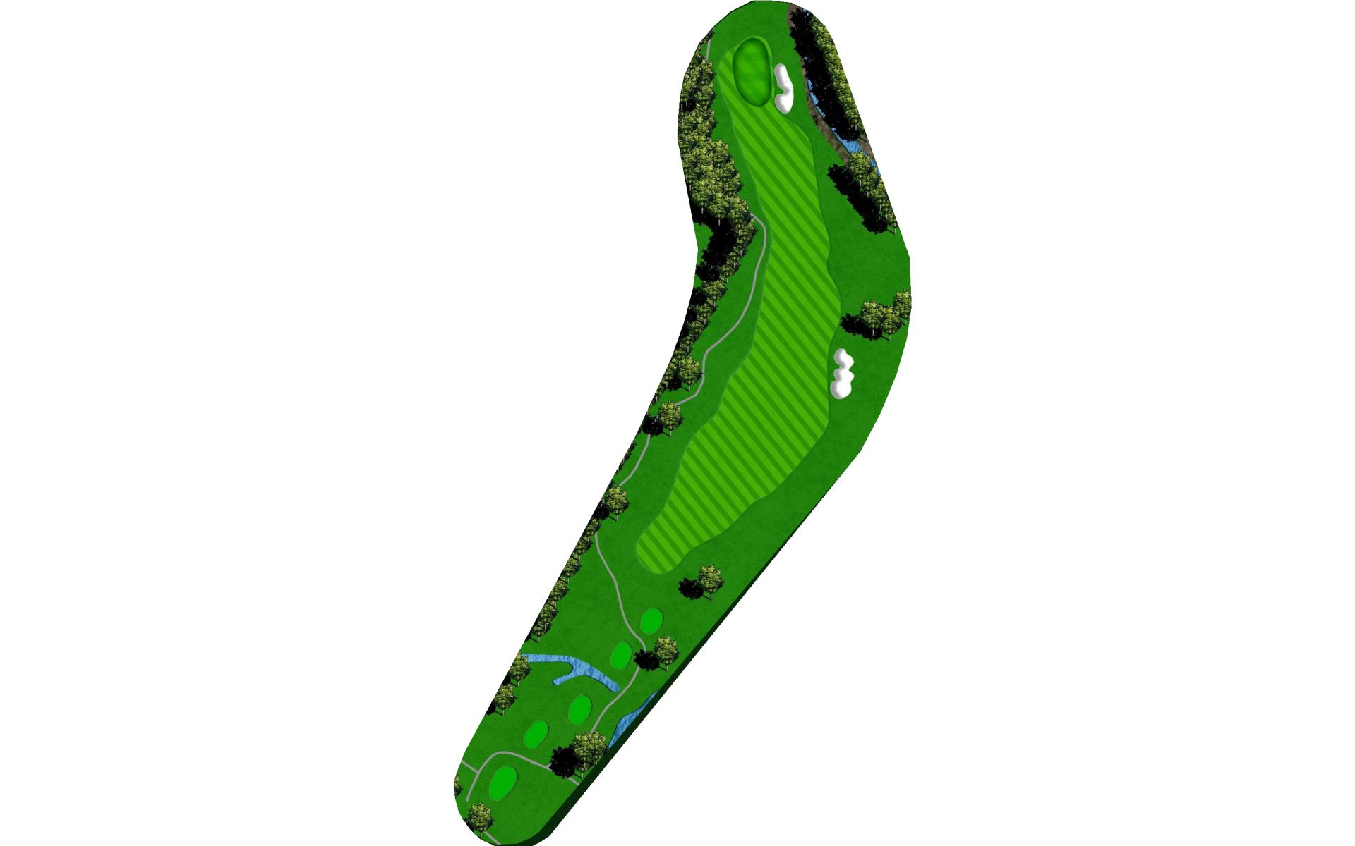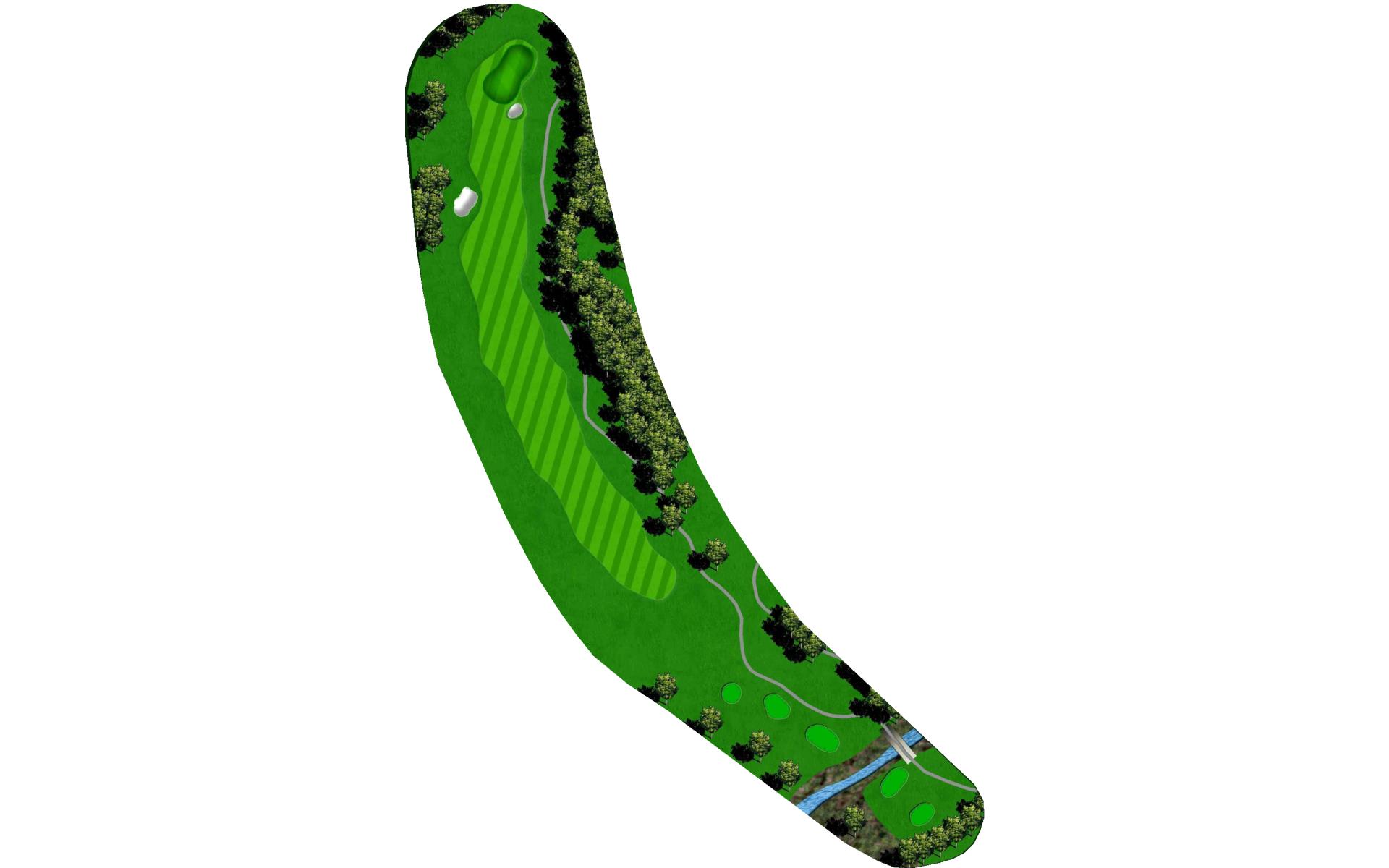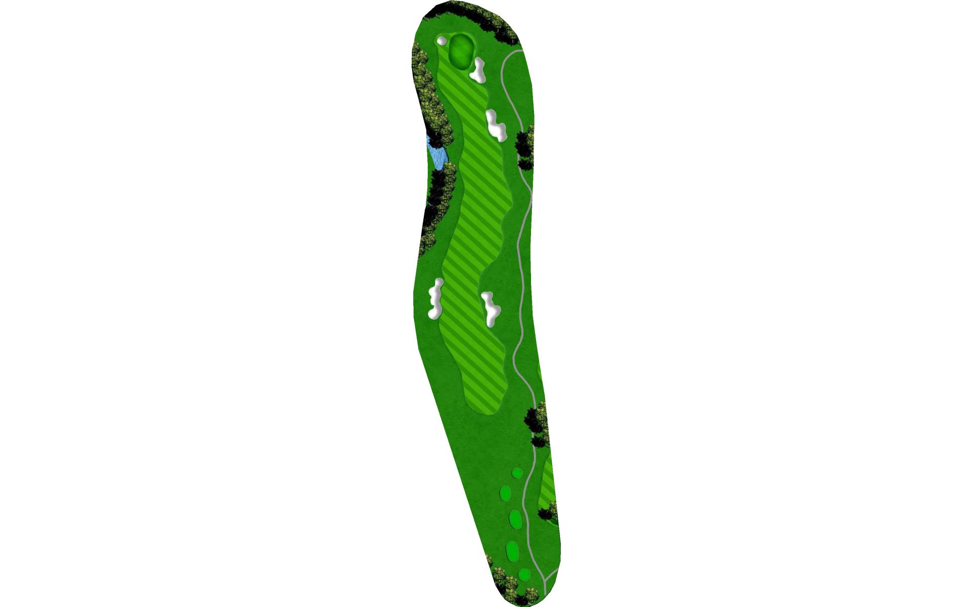This is the only dogleg left Par 4 on the course. Keep your tee shot right and your second shot left. The greens right side is well protected by a deep creek.