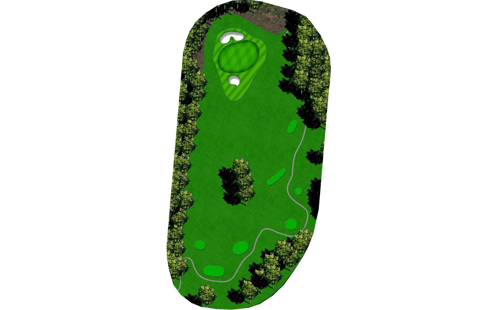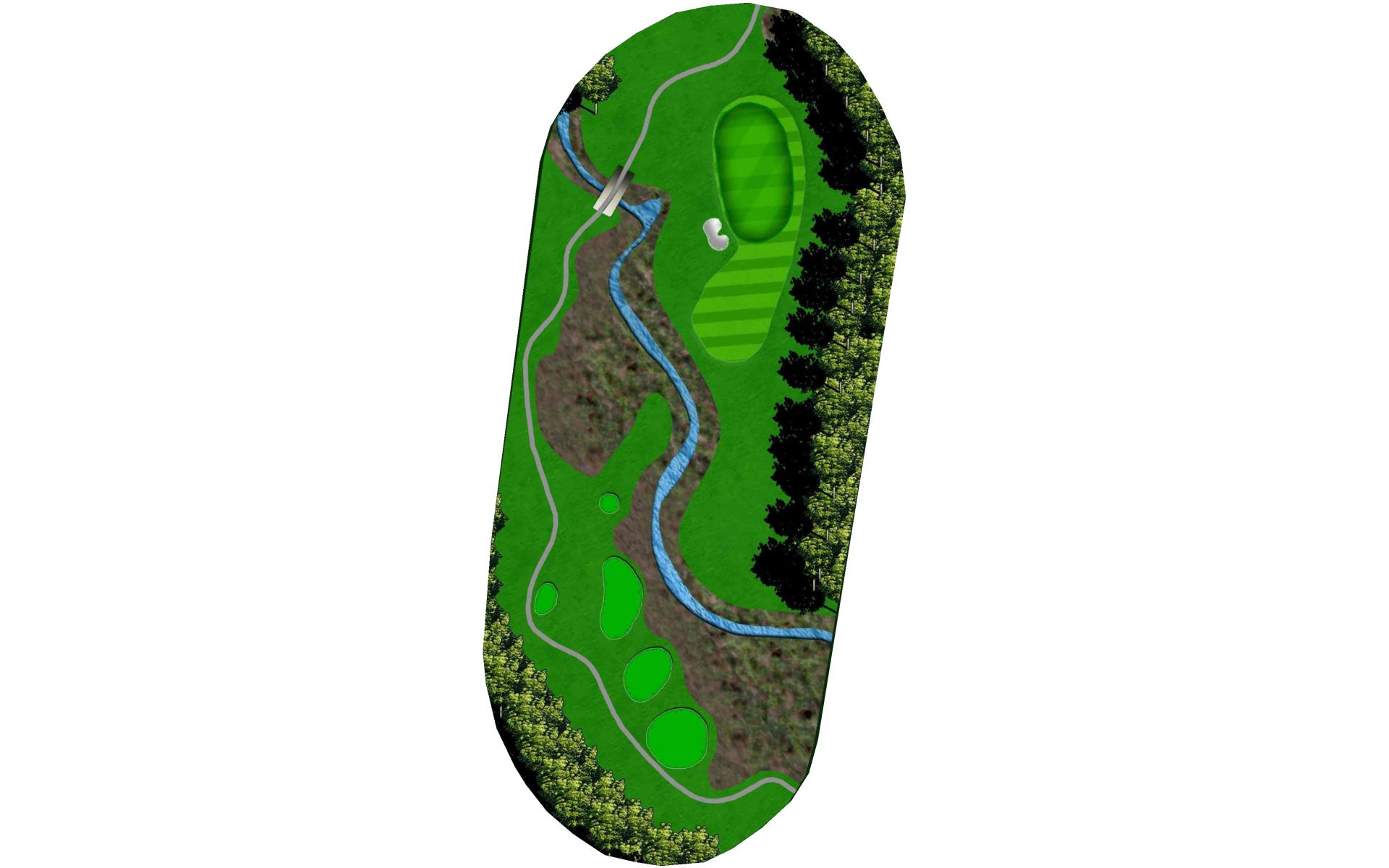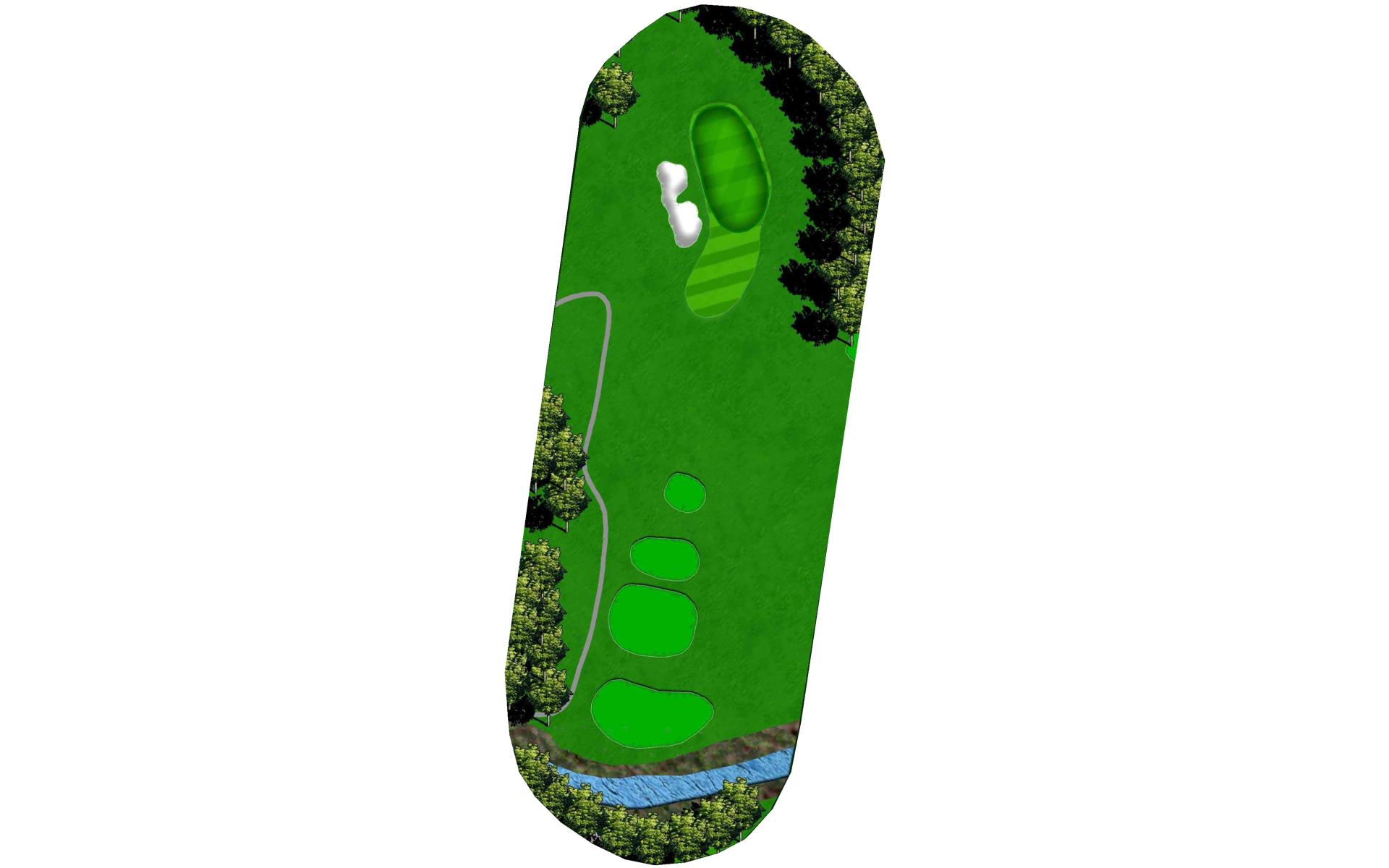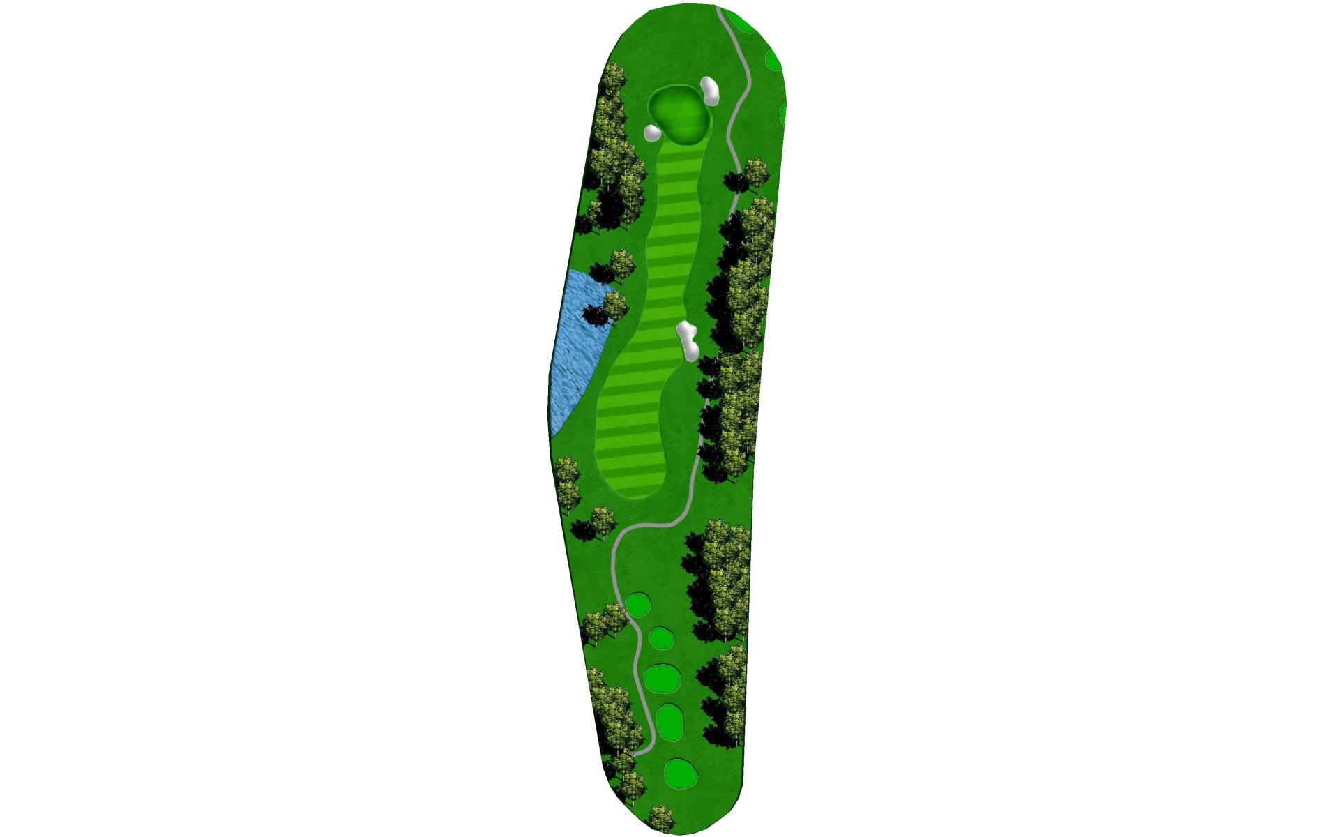 This is the only dogleg left Par 4 on the course. Keep your tee shot right and your second shot left. The greens right side is well protected by a deep creek.