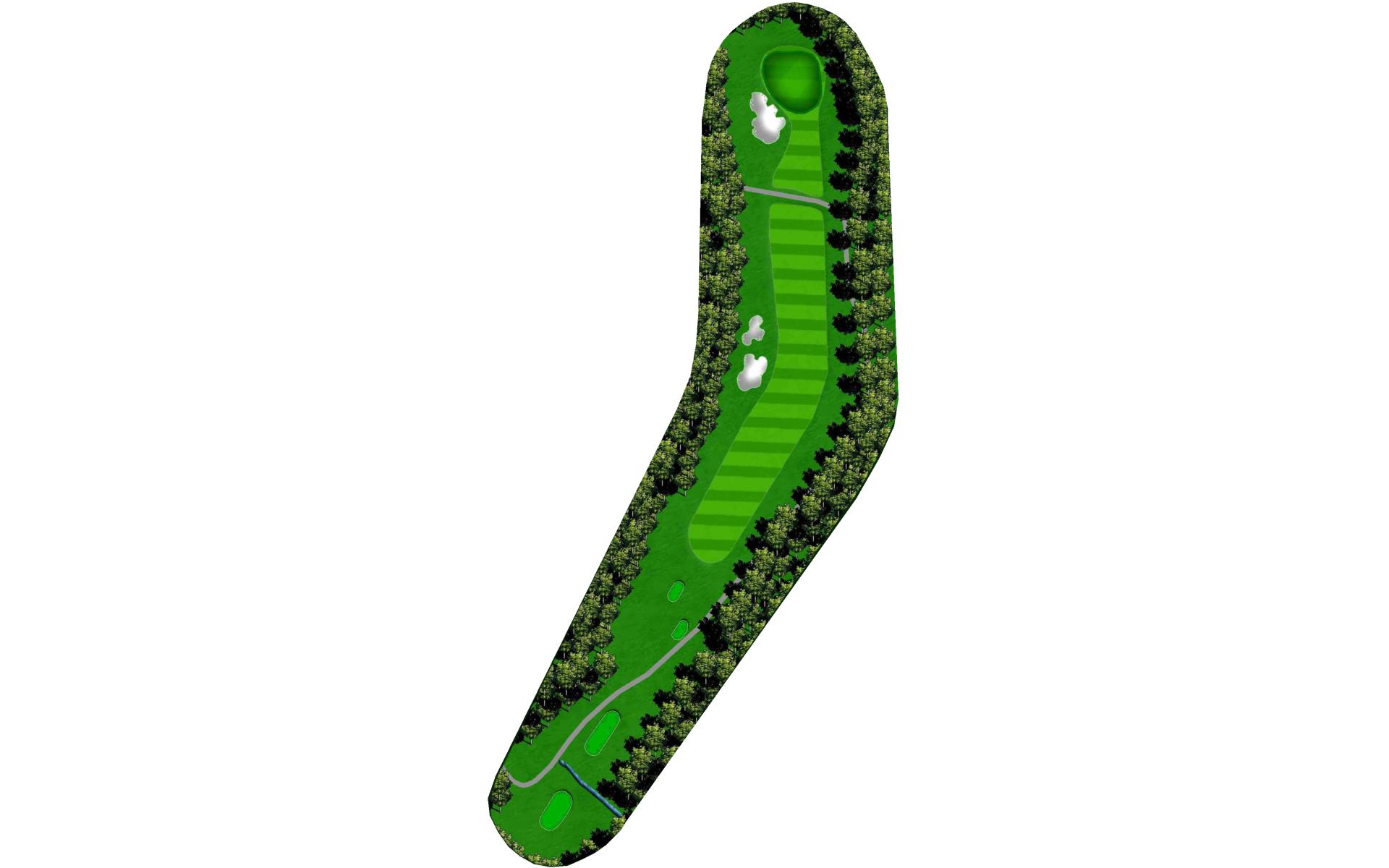 A dogleg right par 4. A tee shot to the corner will give you a mid iron into the green. If you cut the ball you can get it around the corner and have a wedge in your hand. The green is guarded on three sides by bunkers and slopes from back to front.